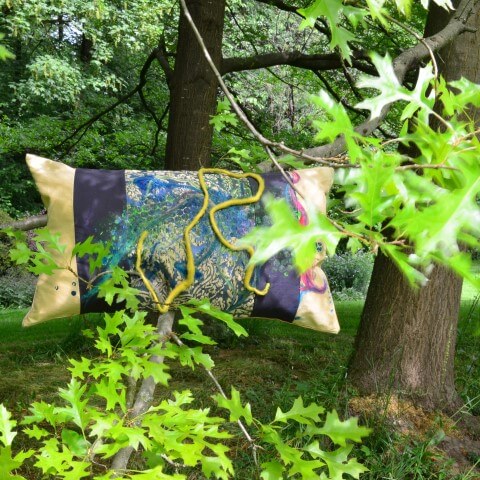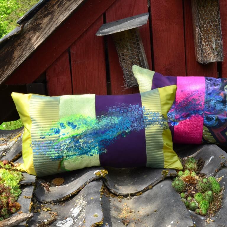 - Kissen-Objekte sind Unikate, die handbemalt, bedruckt und teilweise bestickt sind.