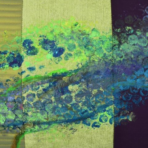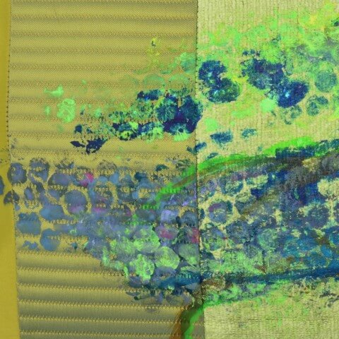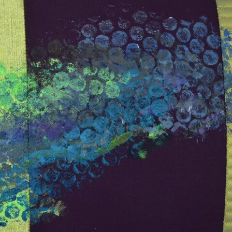 Die Vorderseite besteht aus 4 verschiedenen Stoffen in Lila, verschiedenen Gelbgrün- und Grüntönen sowie Gelb. Es handelt sich um eine Seidenmischung, Baumwollstoffe und einen samtartigen Interieurstoff, eine Baumwollmischung. Es wurden Interieurstoffe mit Kleiderstoffen kombiniert.