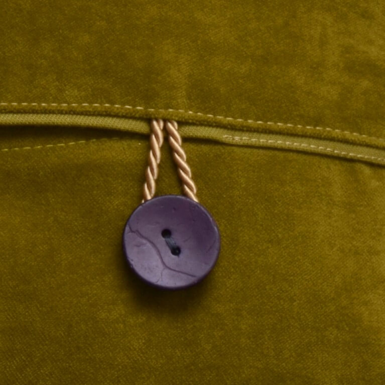 Knöpfe: Wie alle Kissen von AN-NA Design hat auch dieses einen Verschluss aus 3 Knöpfen mit Schlaufen. Hier sind es Kokosknöpfe in Lila. Kokos ist ein Naturprodukt, daher ist die Färbung der Kokos-Knöpfe unregelmäßiger als bei Kunststoffknöpfen, was den besonderen Charakter unserer Kissen unterstreicht. AN-NA Design verwendet Knöpfe aus Naturmaterialien, die nicht abfärben. Sie sind gefärbt, teilweise emailliert oder glasiert.