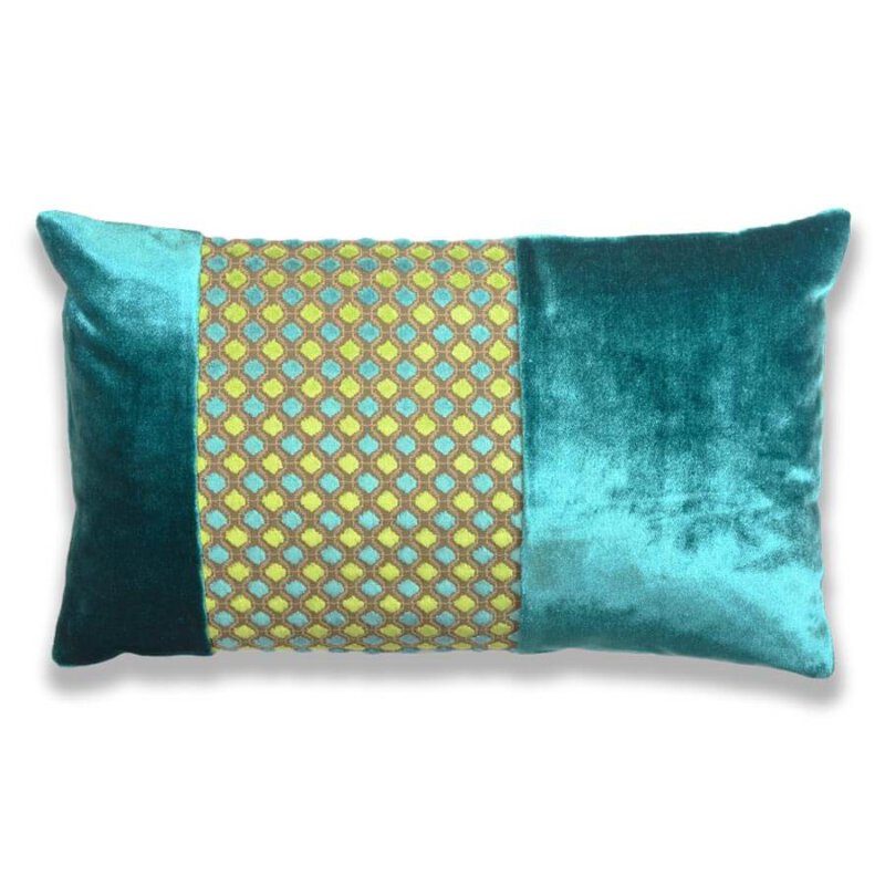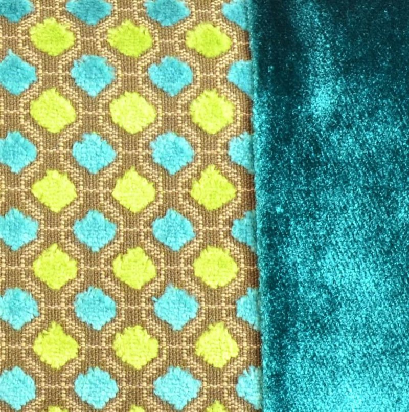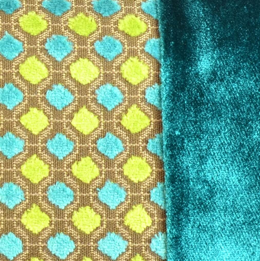 Vorderseite: Hier wurde ein Samtstoff in Moosgrün kombiniert mit einem gemusterten Jacquard-Stoff. Der Jacquard-Stoff hat aufgrund einer speziellen Webtechnik Anteile mit samtartiger Oberfläche, er hat die Farben Caramel, helles Gelb-Grün und Hellblau-Türkis.