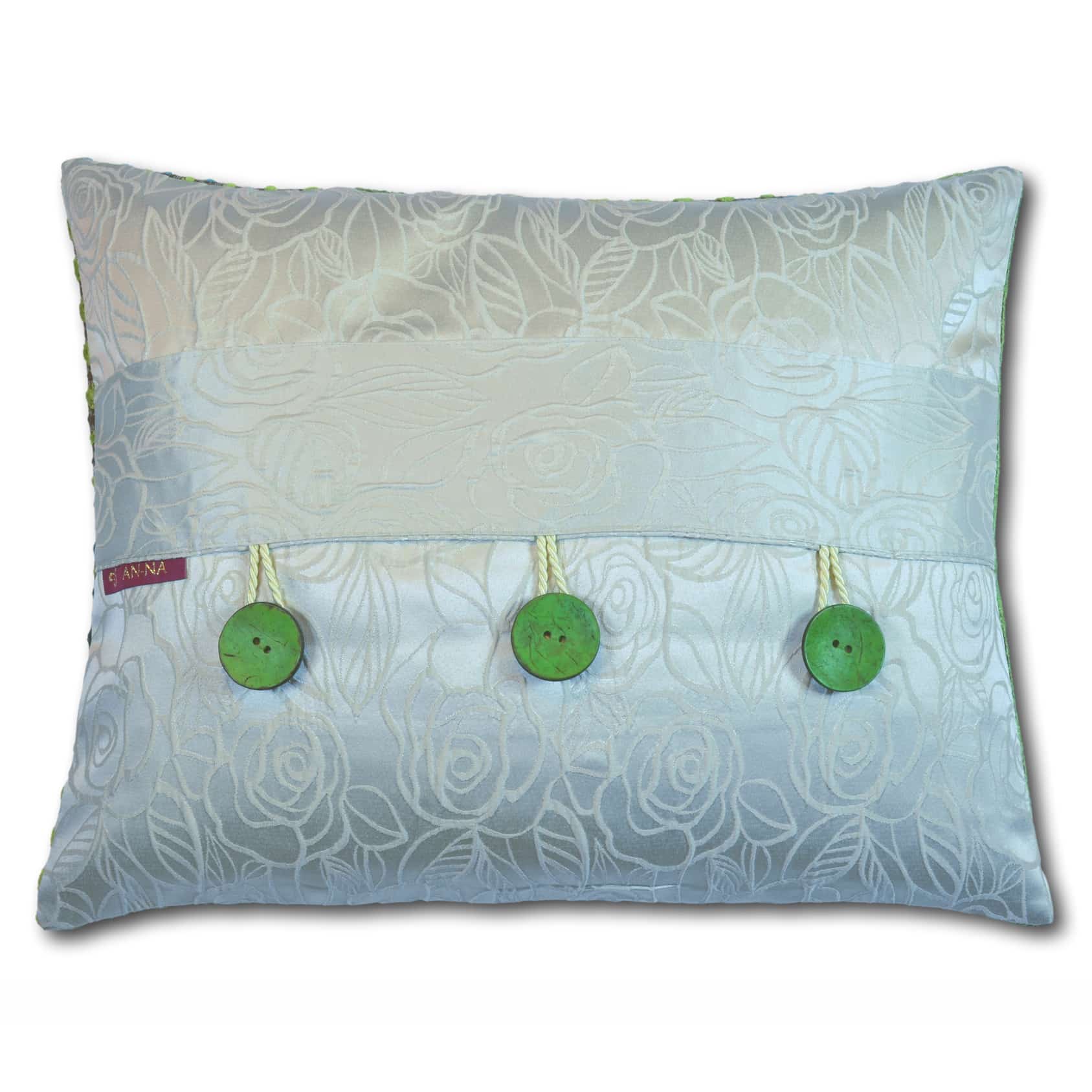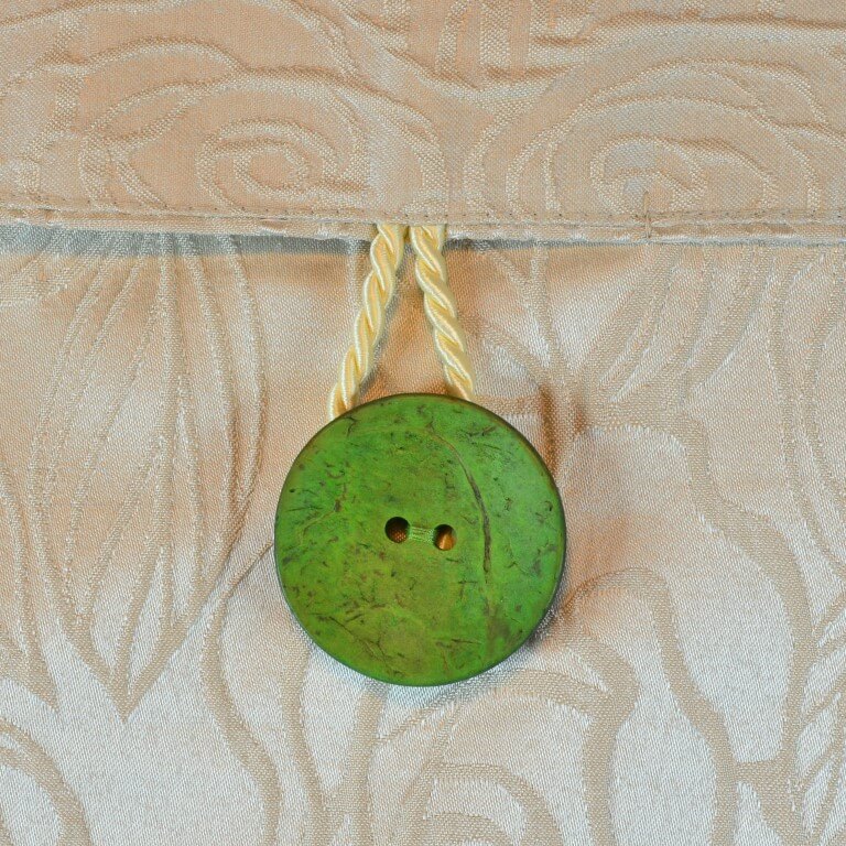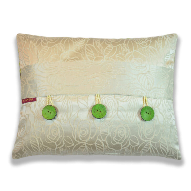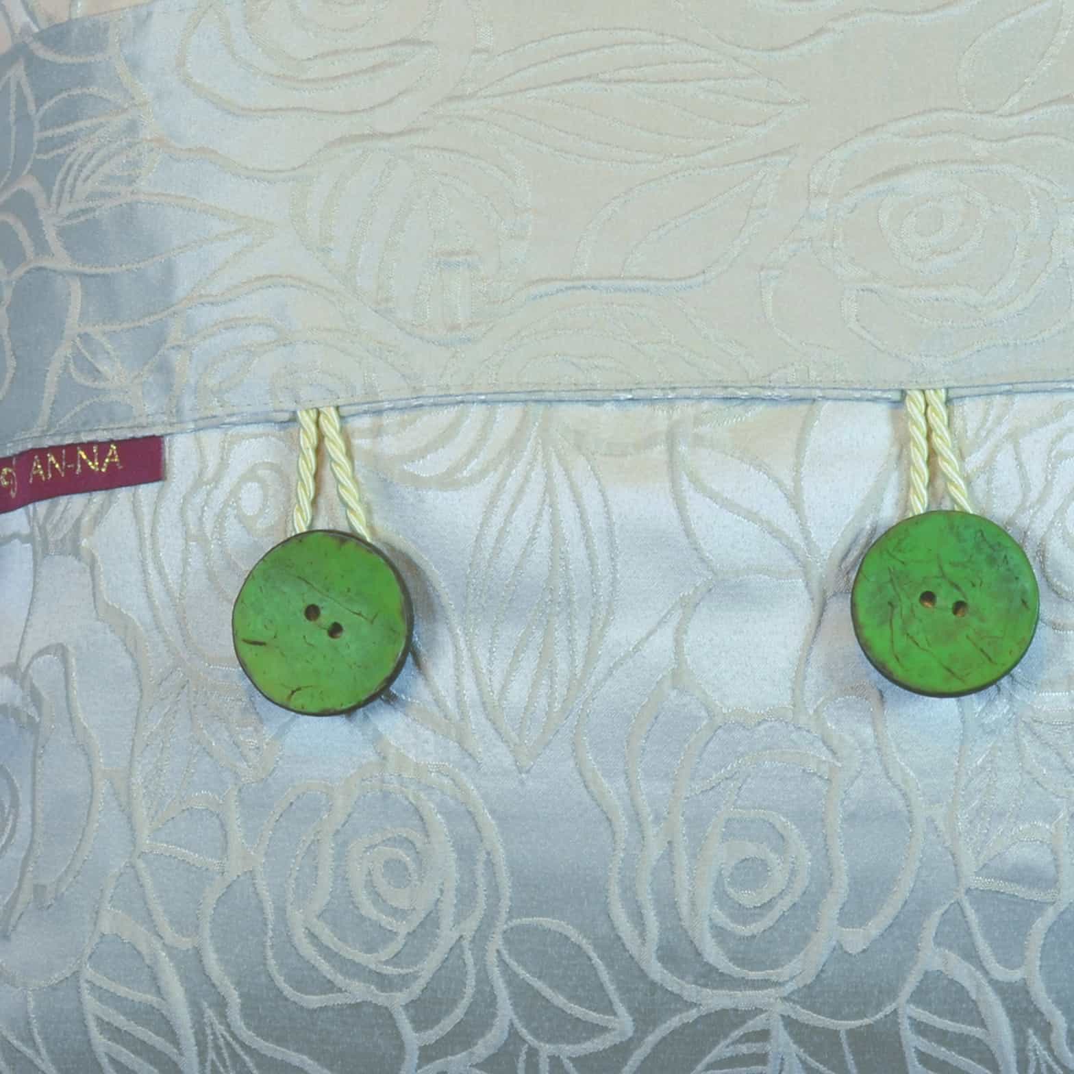Die Rückseite besteht aus einem wollweißen Jacquardstoff, der in sich gemustert ist. Die grünen Kokosknöpfe greifen die Farbgebung der Vorderseite auf.