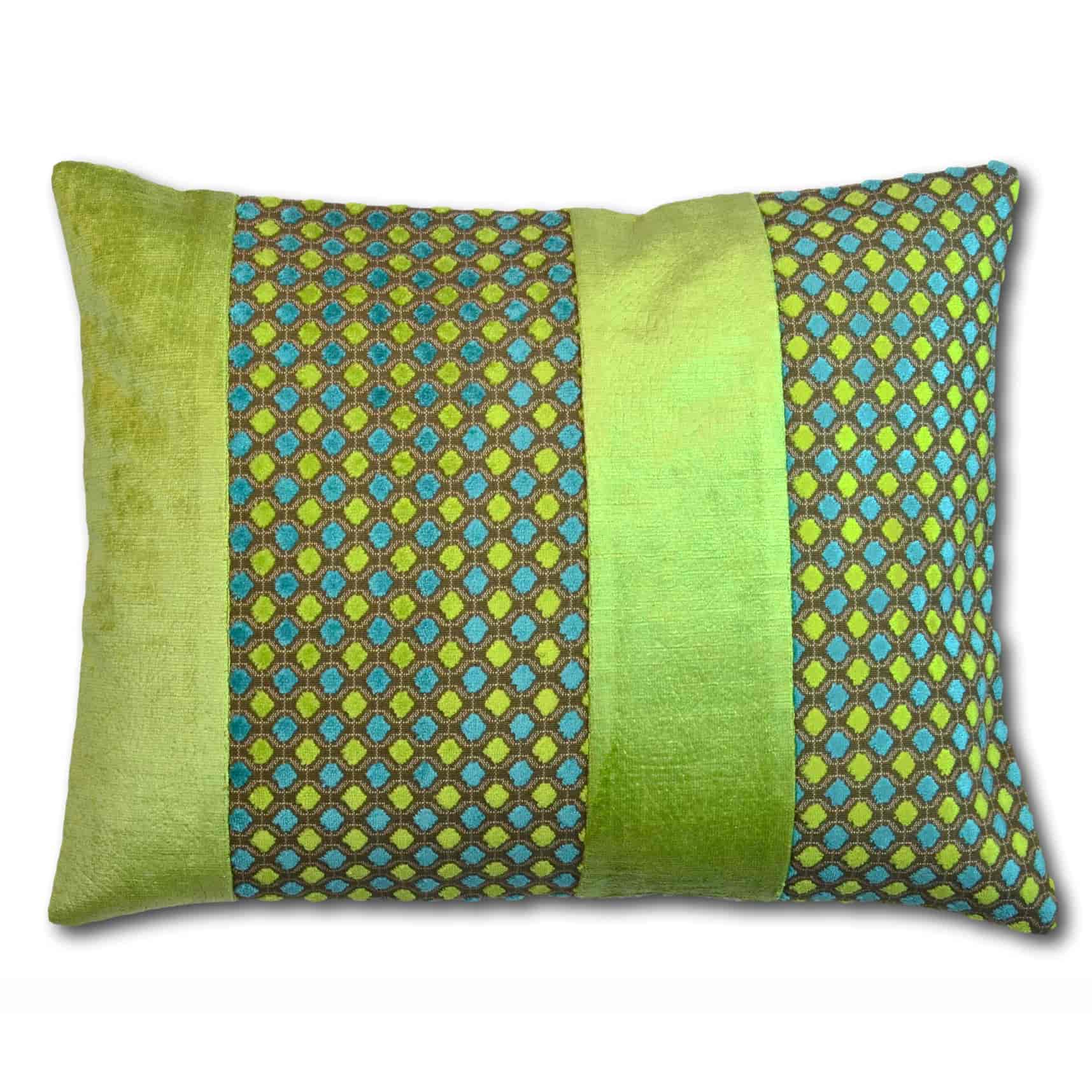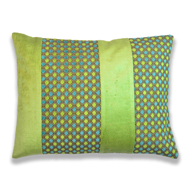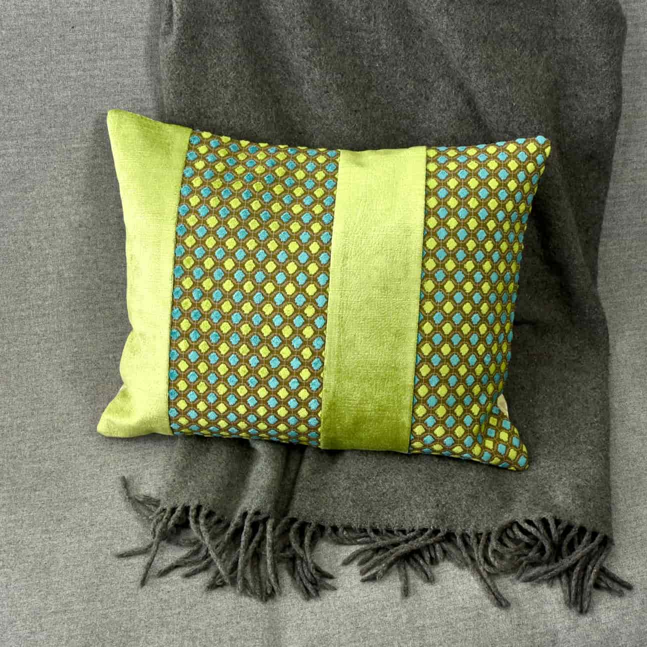 Die Rückseite besteht aus einem wollweißen Jacquardstoff, der in sich gemustert ist. Die grünen Kokosknöpfe greifen die Farbgebung der Vorderseite auf.