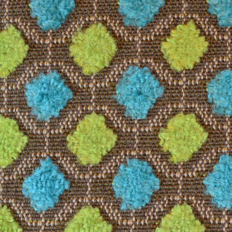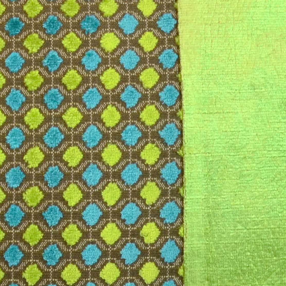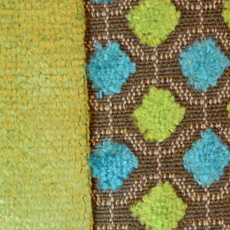Auf der Vorderseite wurde ein Samtstoff in einem hellen Gelb-Grün kombiniert mit einem Jacquard-Stoff. Der Samt hat aufgrund der Webart eine etwas unregelmäßige Struktur. Der Jacquard hat aufgrund einer speziellen Webtechnik Anteile mit samtartiger Oberfläche, er ist in den Farben Caramel, helles Gelb-Grün und Hellblau-Türkis gehalten.