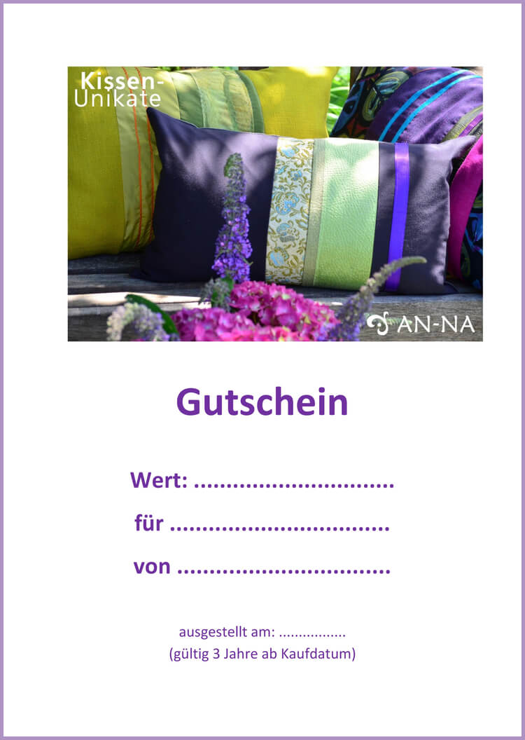 Gültigkeit des Gutscheins: 3 Jahre ab Kaufdatum. Das Kaufdatum entspricht dem Ausstellungsdatum, welches von AN-NA Design zusammen mit dem Wert auf dem Gutschein vermerkt wird.