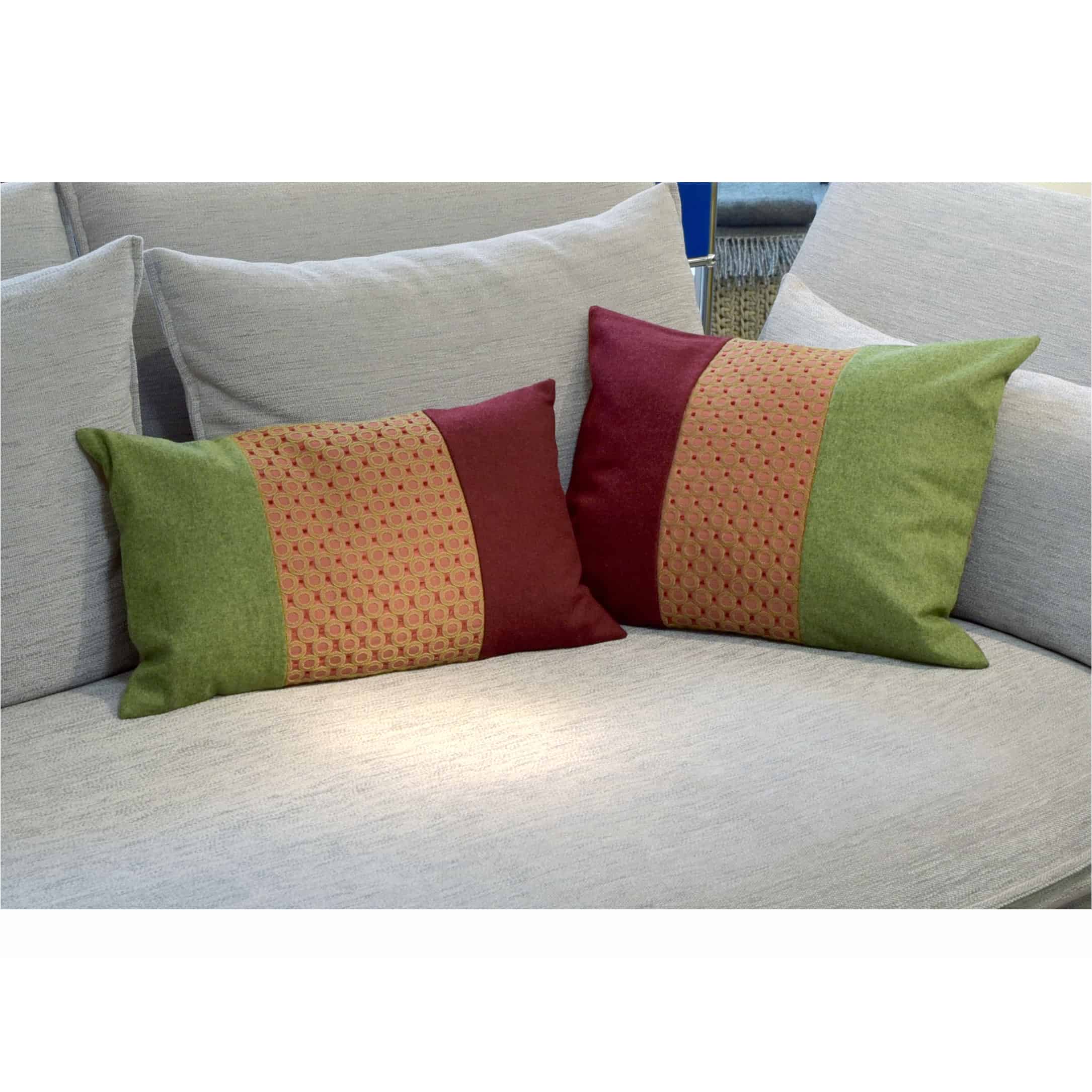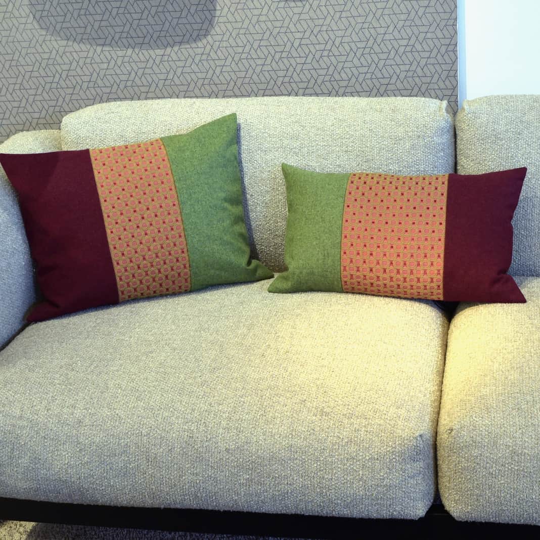 Vorderseite: Die Stoffe auf der rechten und linken Kissen-Seite sind Woll-Tuchstoffe der deutschen Tuchfabrik Mehler. Die beiden Stoffe sind dezent meliert und haben einen festen und dennoch weichen Griff.