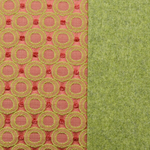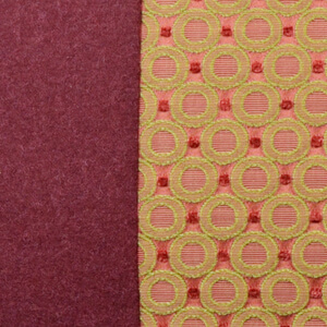 Der Interieur-Stoff in der Mitte wurde von Voghi in Como/Italien gewebt. Er ist in Grün und Rot gehalten. Das Grün tendiert zu einem Maigrün, das Rot zu einem Bordeauxrot mit einem ganz leichten Pink-Stich.