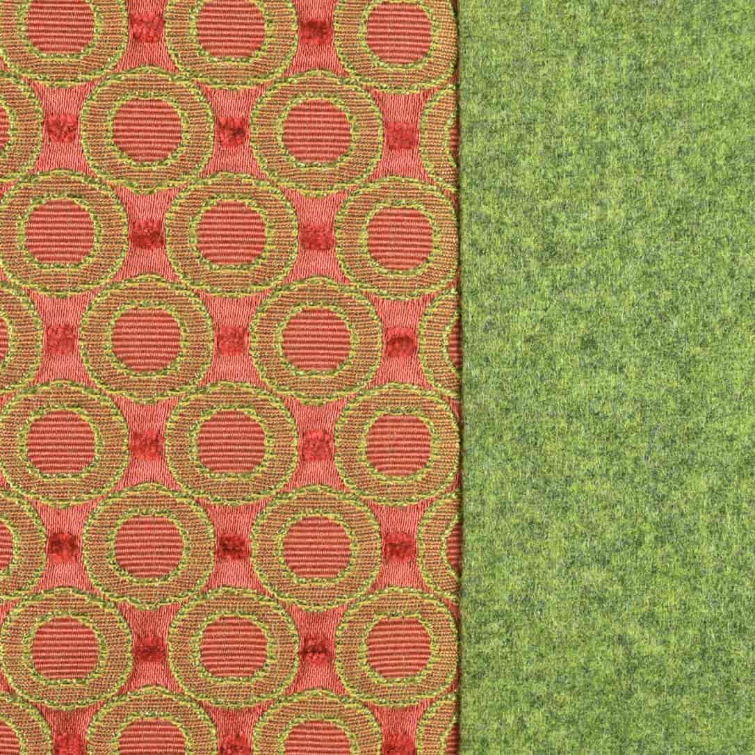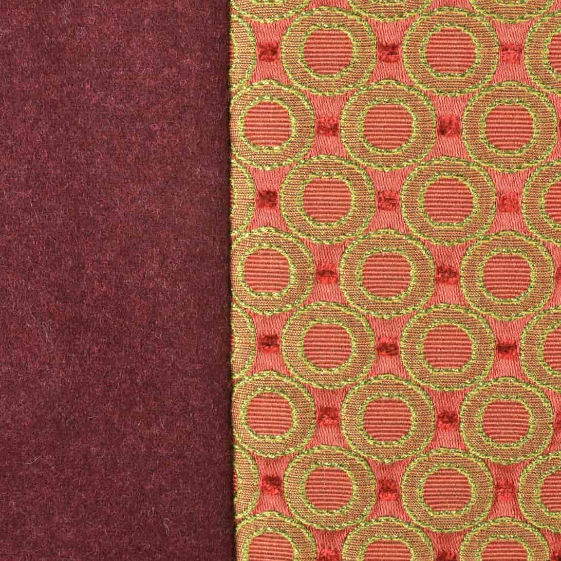Der Interieur-Stoff in der Mitte wurde von Voghi in Como/Italien gewebt. Er ist in Grün und Rot gehalten. Das Grün tendiert zu einem Maigrün, das Rot zu einem Bordeauxrot mit einem ganz leichten Pink-Stich.