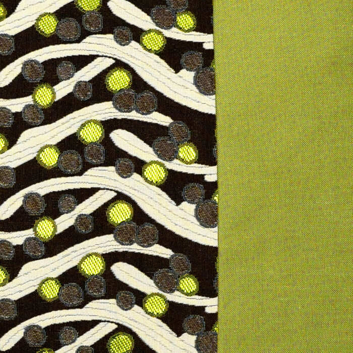 Vorderseite: Der mittlere Stoff ist ein Jacquard mit eingewebtem Muster in den Farben Gelbgrün, Braun und Beige.