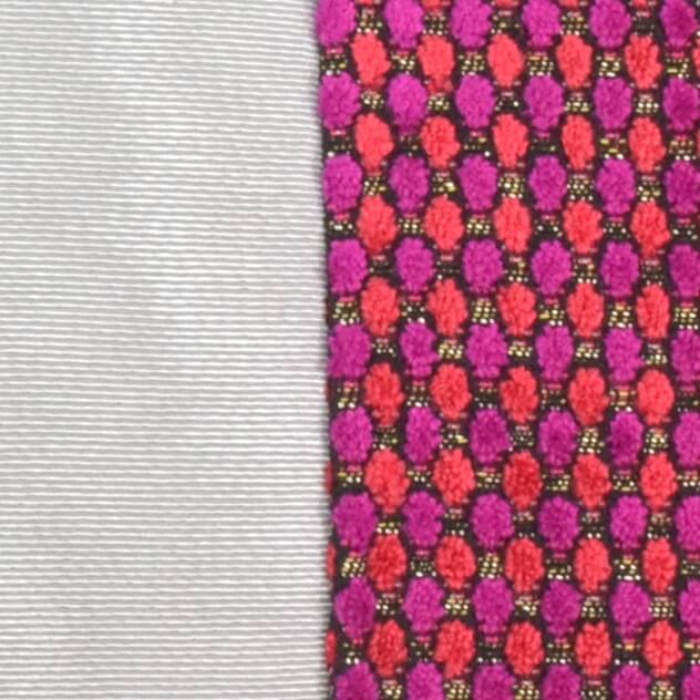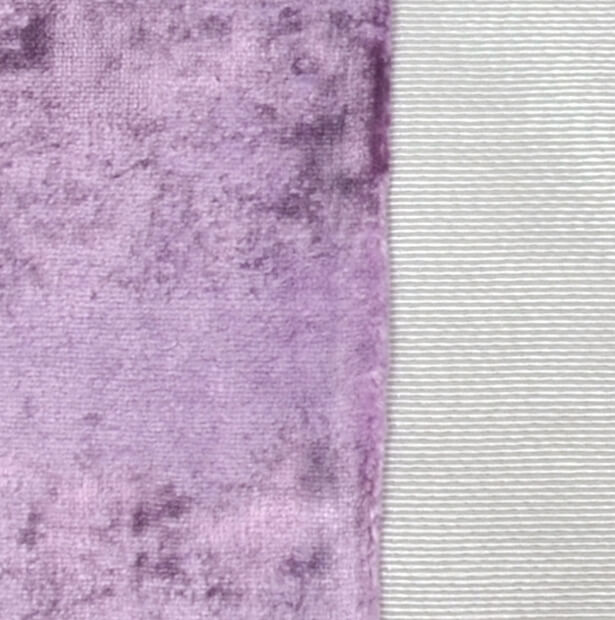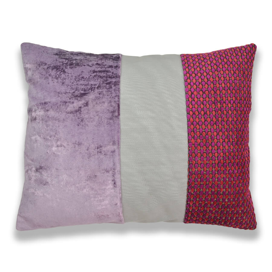 Vorderseite: Der Samtstoff auf der linken Seite des Kissens hat einen hellen Violett- bzw. Lavendel-Ton. Auf der rechten Seite wurde ebenfalls ein Samt-Stoff in Ausbrenner-Optik verarbeitet. Er zeigt einen Farbmix aus kräftigem Pink, Rot-Orange, dezentem Schwarz als Untergrund und feinen Metallic-Fäden. Bei dem mittleren Stoff handelt es sich um ein geripptes Baumwoll-Mischgewebe in einem feinen Hellgrau. Durch den Farbkontrast und die leuchtenden Farben bringt das Kissen eine heitere Frühlingsstimmung in in Ihre Wohnung.