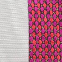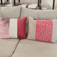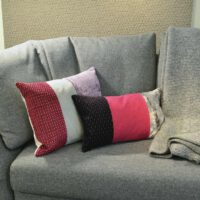 Vorderseite: Der Samtstoff auf der linken Seite des Kissens hat einen hellen Violett- bzw. Lavendel-Ton. Auf der rechten Seite wurde ebenfalls ein Samt-Stoff in Ausbrenner-Optik verarbeitet. Er zeigt einen Farbmix aus kräftigem Pink, Rot-Orange, dezentem Schwarz als Untergrund und feinen Metallic-Fäden. Bei dem mittleren Stoff handelt es sich um ein geripptes Baumwoll-Mischgewebe in einem feinen Hellgrau. Durch den Farbkontrast und die leuchtenden Farben bringt das Kissen eine heitere Frühlingsstimmung in in Ihre Wohnung.