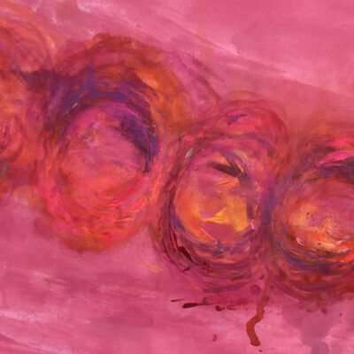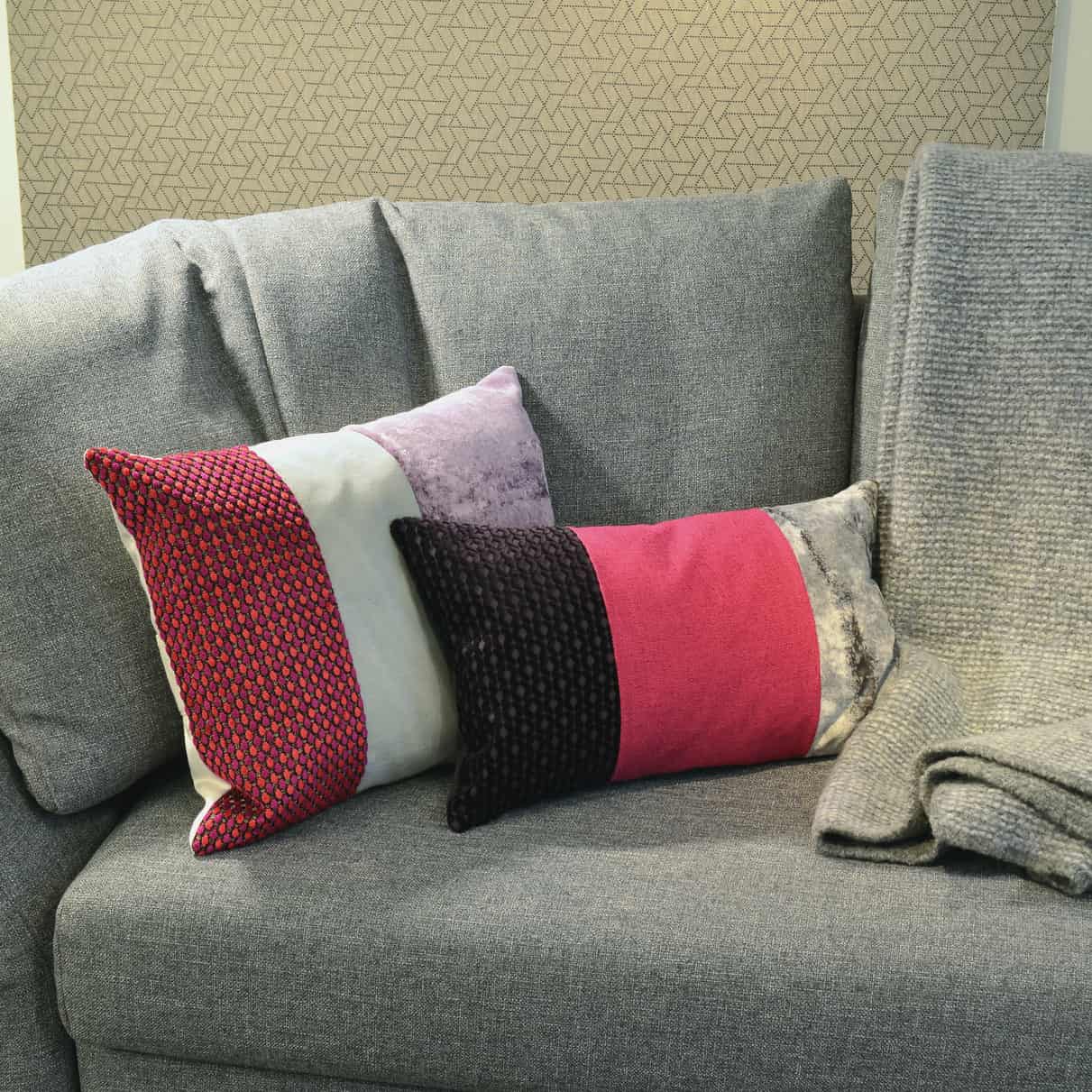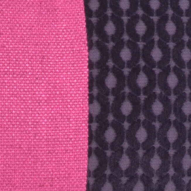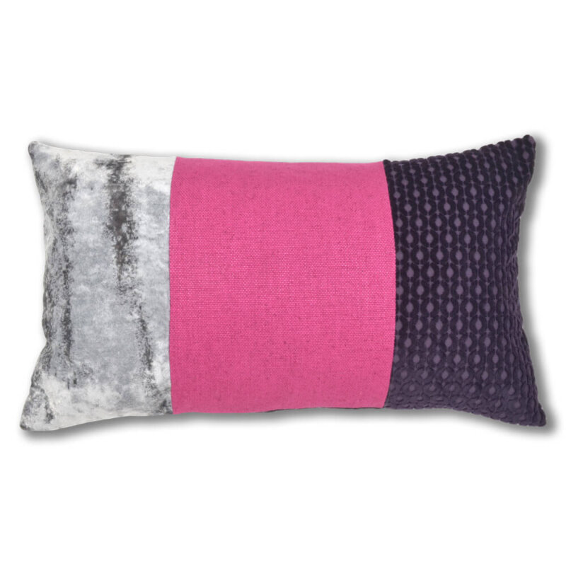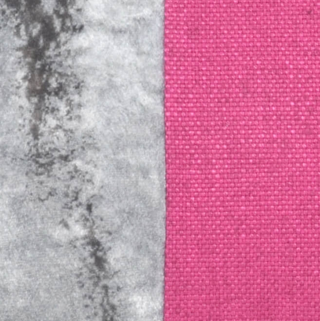 Vorderseite: Der Samtstoff auf der linken Seite des Kissens hat einen hellen Grau-Violett- bzw. Mauve-Ton. Auf der rechten Seite wurde ebenfalls ein Samt-Stoff verarbeitet. Er hat einen dunklen Violett-Aubergine-Farbton. Bei dem mittleren Stoff handelt es sich um ein glattes Baumwoll-Mischgewebe in strahlendem Pink. Durch den Farbkontrast und das leuchtende Pink bringt das Kissen Frühlingsstimmung in in Ihre Wohnung.