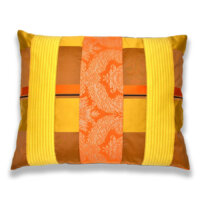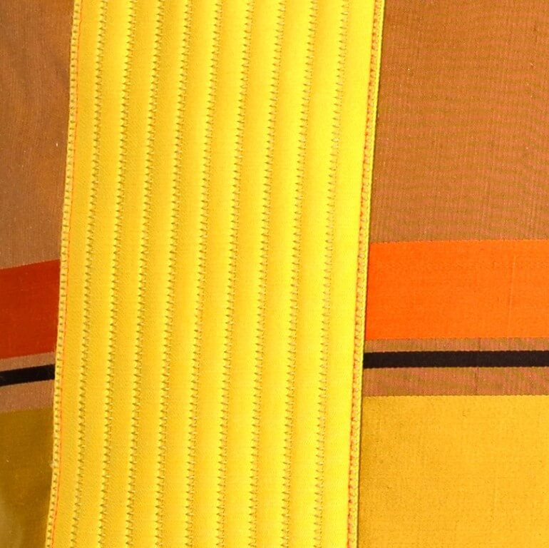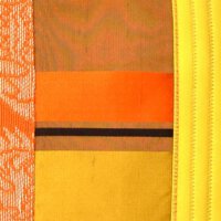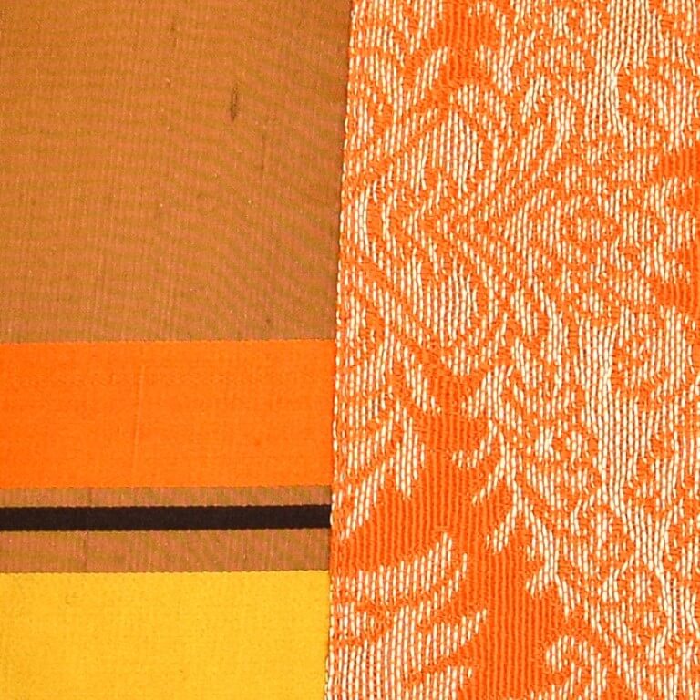 Die Vorderseite wurde aus drei verschiedenen Stoffen gearbeitet. Es wurden Stoffe in harmonisierenden Gelb- Orange- und Kupfertönen gewählt. Der mittlere Stoff ist ein Jacquard-Gewebe in Orange und Weiß. Einige der verwendeten Stoffe haben einen Seidenanteil und sind – wie Naturseide – etwas unregelmäßig gewebt.