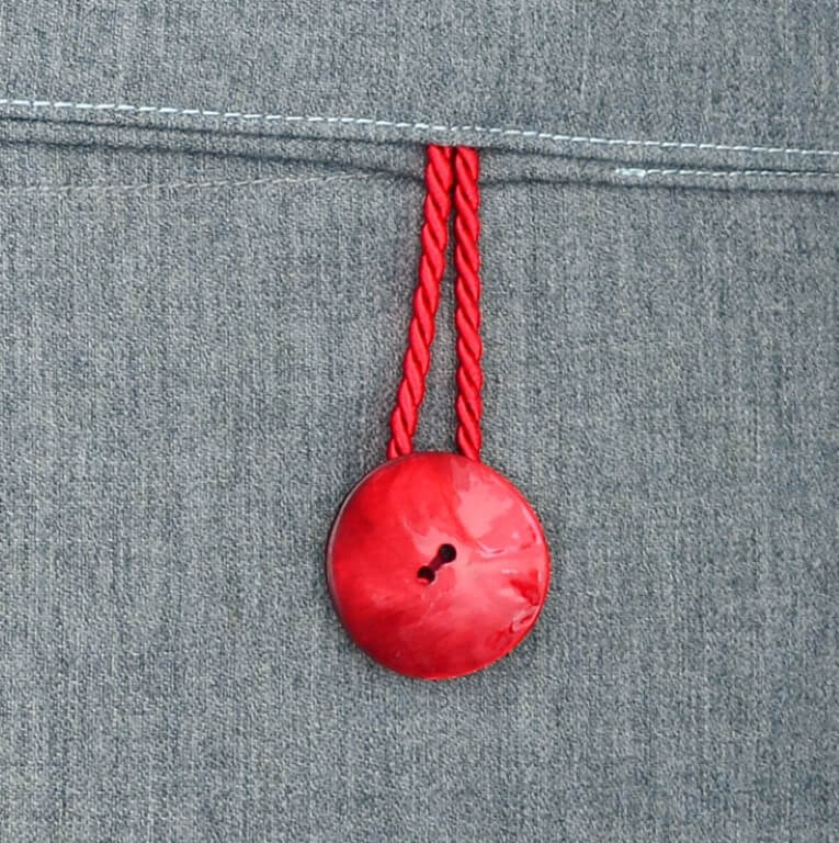 Rückseite: Der Stoff der Rückseite besteht aus einem dezent grau-melierten Mischgewebe, auf dem die roten Perlmutt-Knöpfe des Verschlusses gut zur Geltung kommen.