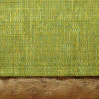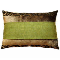 Vorderseite: Hier wurde ein kurzfloriger Samtstoff in einem dunklen Sahara-Ton kombiniert mit einem maigrünen Stoff. Der Samtstoff changiert je nach Lichteinfall. Oben und unten hat das Kissen ein eingewebtes Jacquard-Muster in Schokobraun.