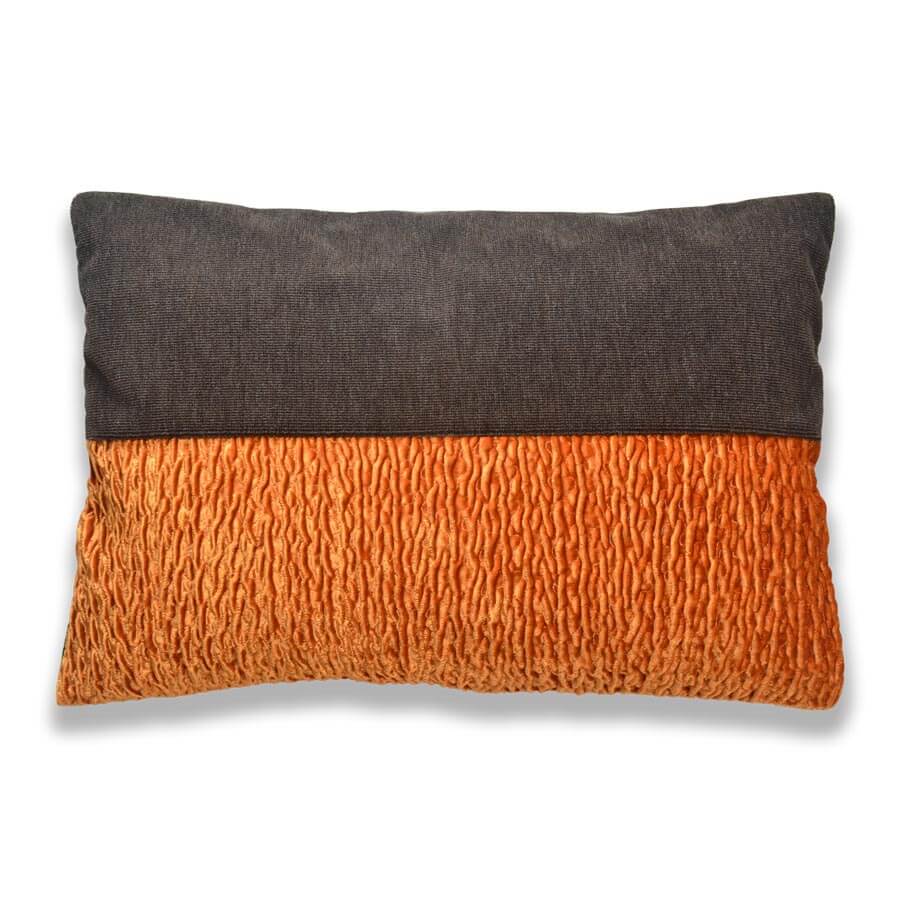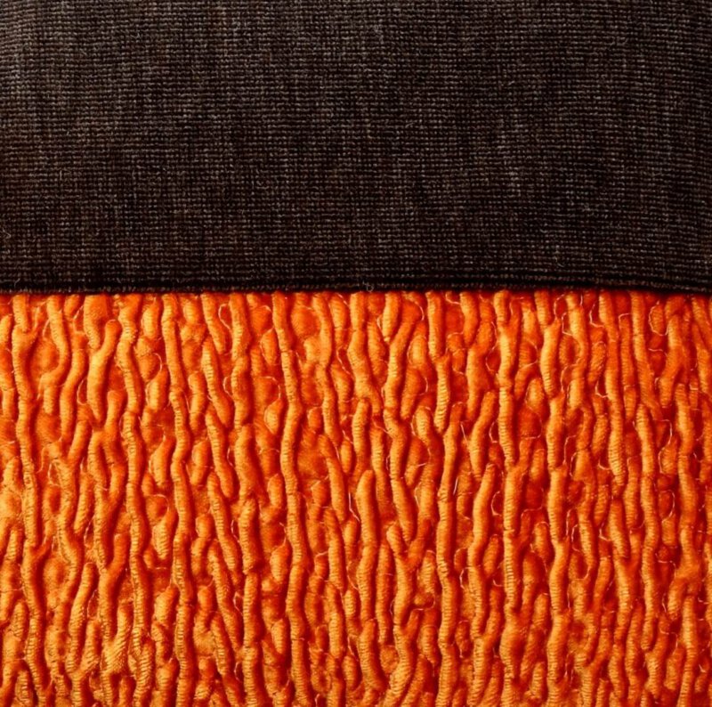 Vorderseite: Hier wurden zwei Samtstoffe des Herstellers Mark Alexander kombiniert, in den Farben Schokobraun und Orange. Der orangefarbene Stoff hat aufgrund einer speziellen Webtechnik ein dreidimensionales Muster und damit eine besondere Haptik.
