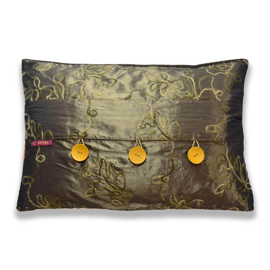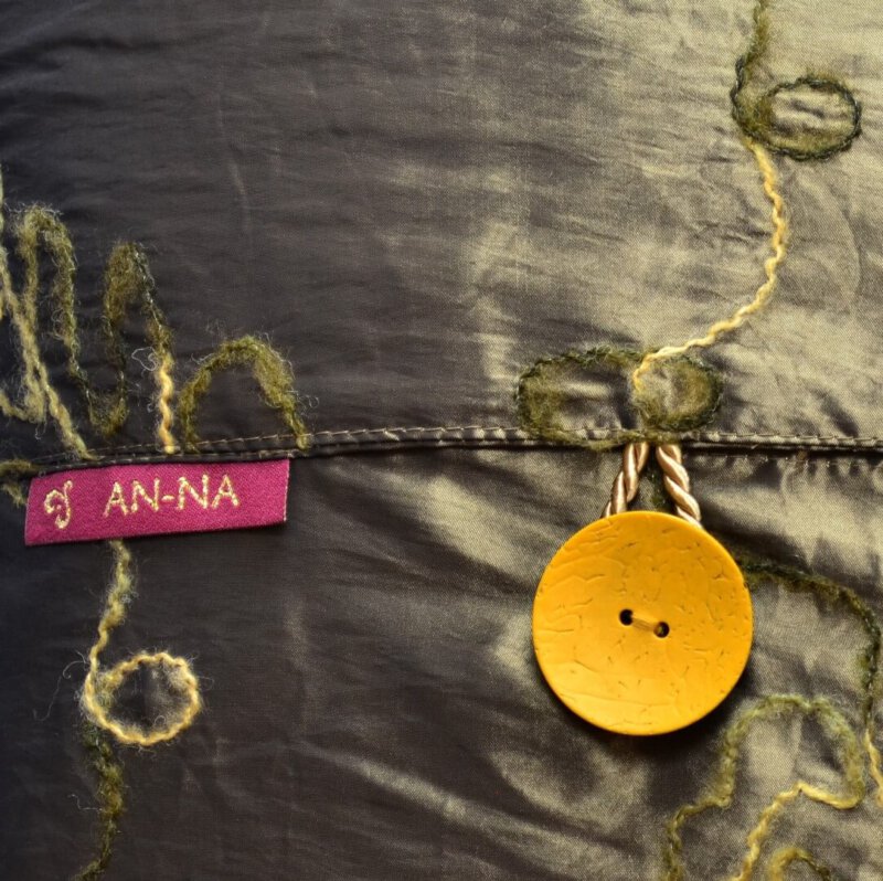 Für die Rückseite wurde ein glänzender Stoff in einem Mittelbraun gewählt. Der Stoff ist mit einem Wollfaden in Beige- und Grüntönen bestickt. Dazu bilden die gelben Kokosknöpfe einen schönen Kontrast.