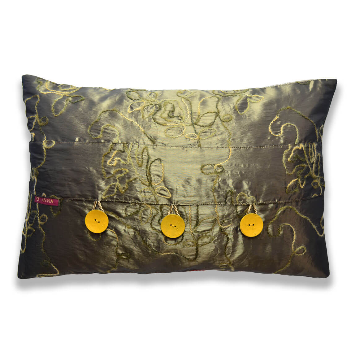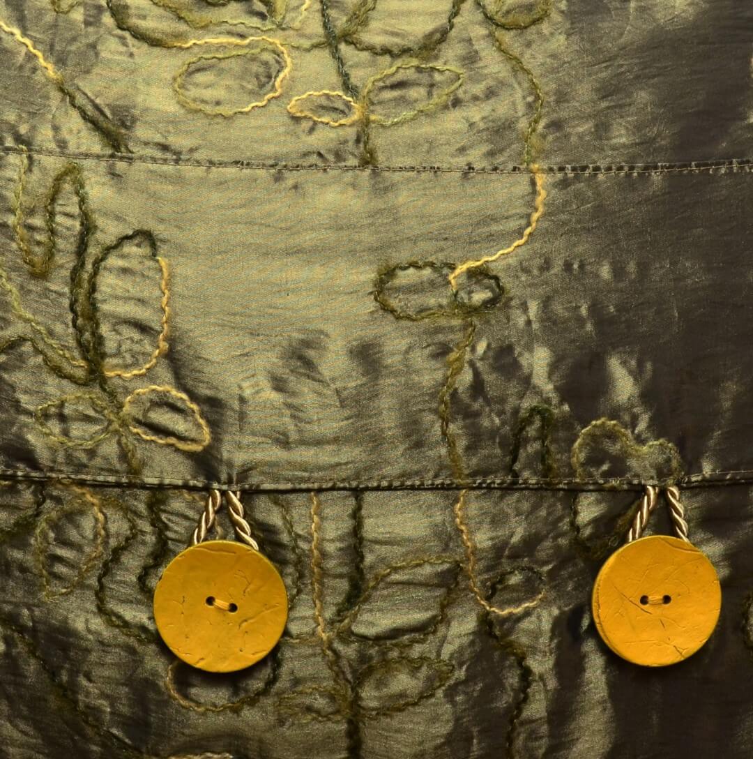 Für die Rückseite wurde ein glänzender Stoff in einem Mittelbraun gewählt. Der Stoff ist mit einem Wollfaden in Beige- und Grüntönen bestickt. Dazu bilden die gelben Kokosknöpfe einen schönen Kontrast.