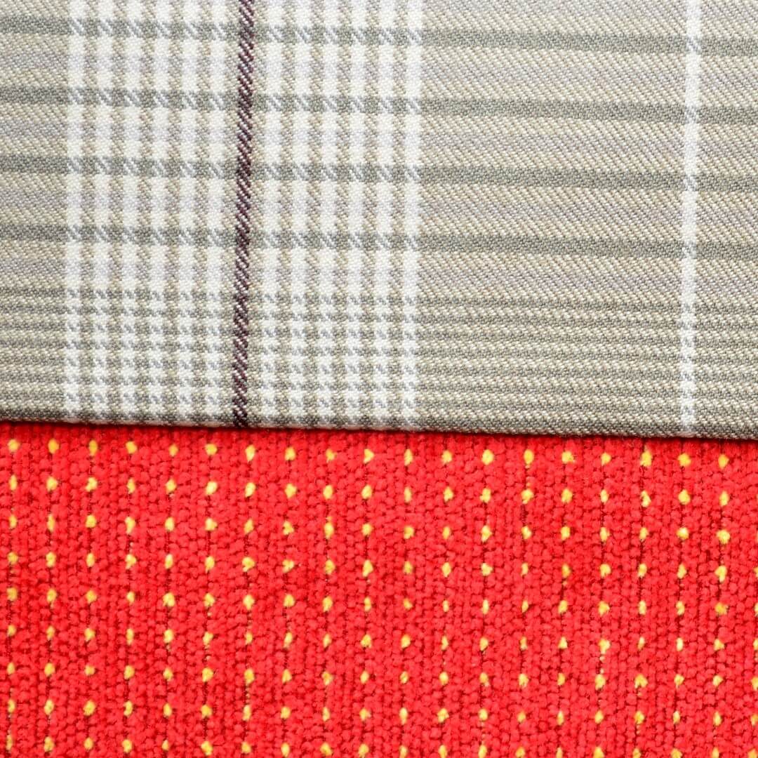 Vorderseite: Hier wurden zwei Stoffe des Herstellers Mark Alexander kombiniert. Der obere ist dezent kariert in verschiedenen Beige-Tönen. Der untere Stoff ist ein kurzfloriger Samt in Orange, er hat ein sehr dezentes grafisches Muster aufgrund eines eingewebten hellgelben Fadens.