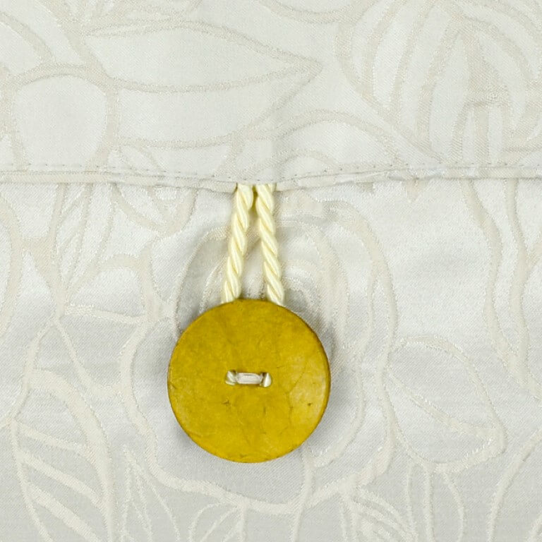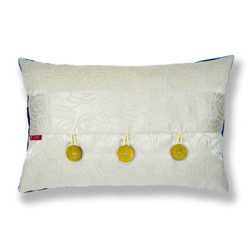Die Rückseite besteht aus einem wollweißen Jacquardstoff, der in sich gemustert ist. Die gelben Kokosknöpfe greifen die Farbgebung der Vorderseite auf.