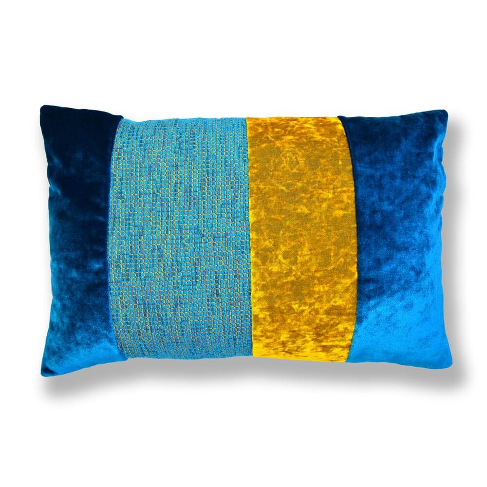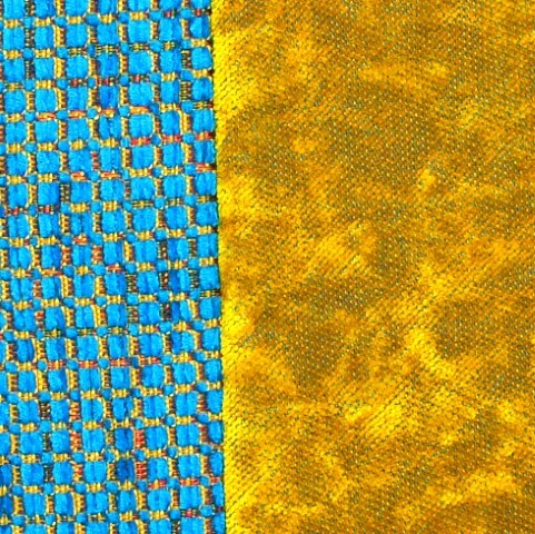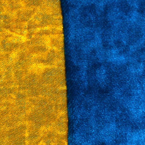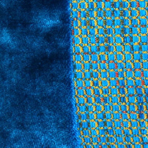 Auf der Vorderseite wurden drei verschiedene Stoffe miteinander verarbeitet, alle haben einen Samt-Charakter. Rechts und links aussen wurde ein Stoff gewählt in einem intensiven Türkis-Blau. Der Stoff links daneben wurde aus einem blauen und einem gelben Faden gewebt, daher ist die Oberfläche blau und der Untergrund gelb. Der blaue Samt auf der Oberfläche bildet ein kleines grafisches Muster. Der gelbe Stoff wurde ebenfalls aus einem blauen und einem gelben Faden gewebt. Hier ist die Oberfläche gelb und der Untergrund blau. Der Untergrund schimmert durch den kurzflorigen Samt, so dass der Stoff etwas changiert und je nach Lichteinfall den Farbton ändert. Das Gelb der Oberfläche wirkt etwas transparent.