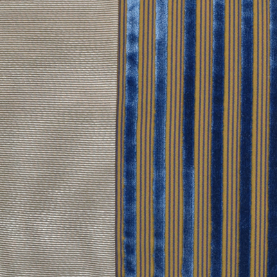 Auf der Vorderseite wurde ein Stoff mit sehr feiner Rippenstruktur kombiniert mit einem Samtstoff. Der blaue Samt in der Mitte wechselt sich ab mit einem glatten Gewebe in den Farben Blau und Curry. Dadurch erhält der mittlere Stoff ebenfalls eine Rippenstruktur.