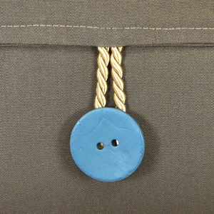 Rückseite: Hier wurde eine Baumwollmischung verarbeitet. Die blauen Kokos-Knöpfe sorgen für einen Kontrast und passen zu dem blauen Samt der Vorderseite. Die Schlaufen für die Verschlüsse bestehen aus Viskose-Kordel.