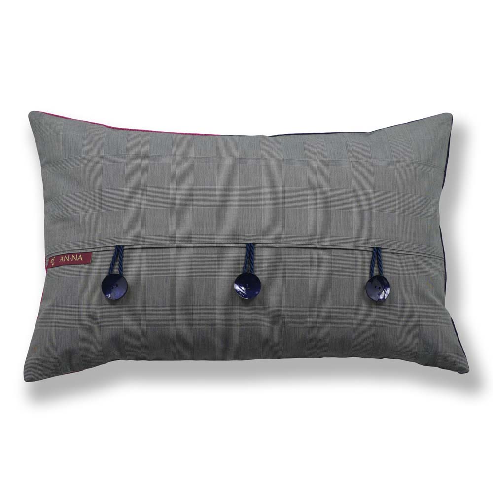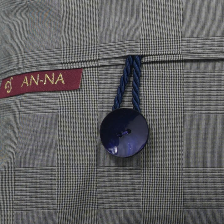 Rückseite: Hier wurde eine graue Baumwollmischung mit einem feinen Karomuster verwendet. Die blauen Knöpfe bestehen aus gefärbtem Perlmutt. Die Schlaufen für die Verschlüsse bestehen aus Viskose-Kordel.