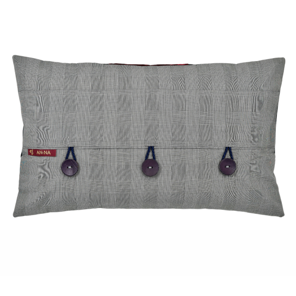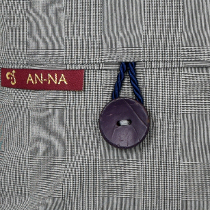 Die Rückseite besteht aus einer Baumwollmischung in Weiß und Schwarz. Dezente Linien bilden grafische Karos. Die violetten Knöpfe bestehen aus Kokos.