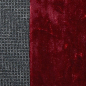 Auf der Vorderseite wurde ein weinroter Samtstoff kombiniert mit einem glatten Stoff in den Farben Grau und Anthrazit. In dem Samt sind Ton-in-Ton die Umrisse eines grafischen Blütenmusters eingewebt.