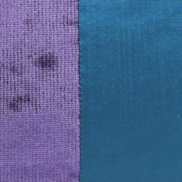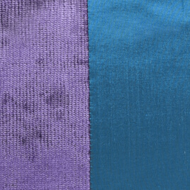Vorderseite: Auf der Vorderseite wurden ein lilafarbener Samtstoff zusammen mit einem türkisfarbenen Seidenstoff verarbeitet. Der Samt ist kurzflorig, je nach Lichteinfall und Strichrichtung changiert er. Dadurch ergeben sich auf den Fotos unterschiedlich hellere Stellen im Stoff.