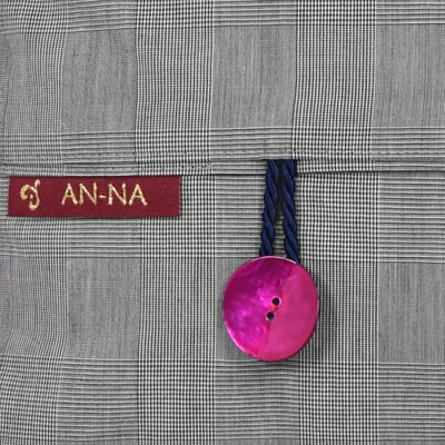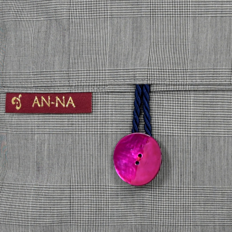 Rückseite: Hier wurde eine Baumwollmischung mit einem feinen Karomuster verarbeitet. Die pinkfarbenen Knöpfe bestehen aus gefärbtem Perlmutt. Die Schlaufen für die Verschlüsse bestehen aus Viskose-Kordel.