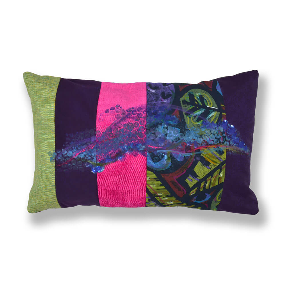 - Kissen-Objekte sind Unikate, die handbemalt, bedruckt und teilweise bestickt sind.