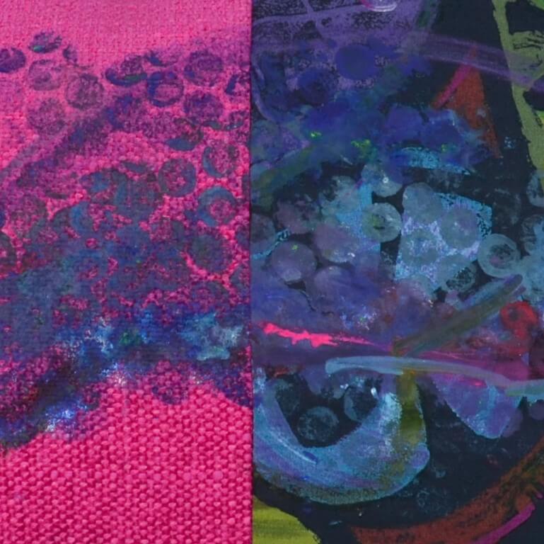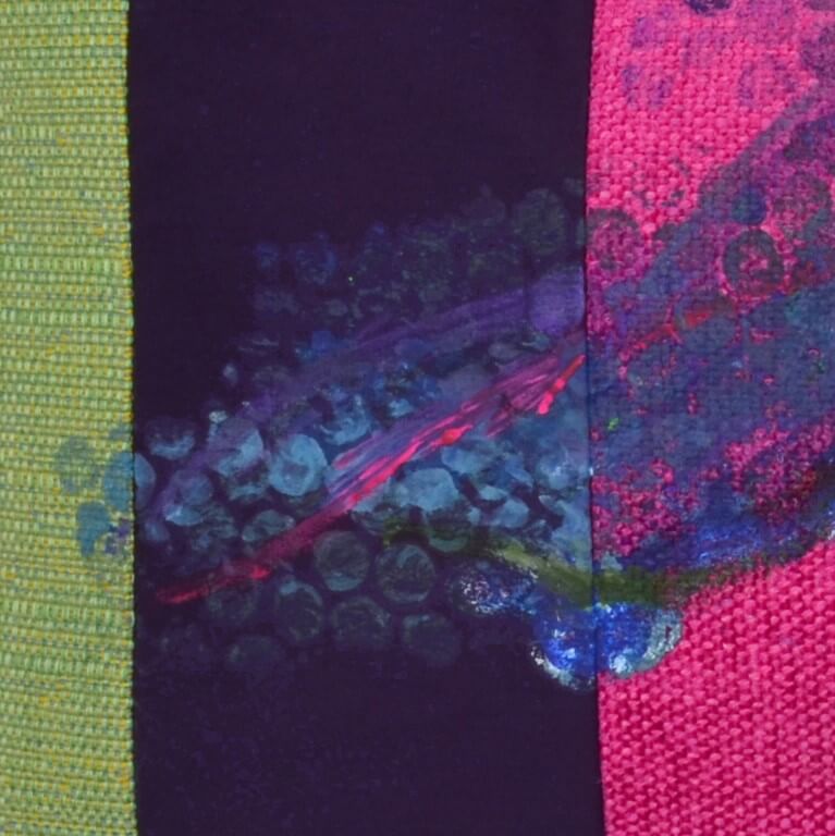 Die Vorderseite besteht aus 4 verschiedenen Stoffen, überwiegend in Lila-, Pink- und Grüntönen. Es handelt sich um eine Leinen-Seidenmischung, und um Baumwollstoffe. Es wurden Interieurstoffe mit Kleiderstoffen kombiniert.