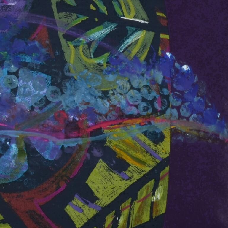 Vorderseite: Diese Vorderseite eines Kissen-Unikats von AN-NA Design wurde handbedruckt und handbemalt. Ich habe in Mischtechnik gearbeitet, unter Verwendung von Stoff-Farben, Acryl- und Aquarellfarben und Aquarellkreiden.